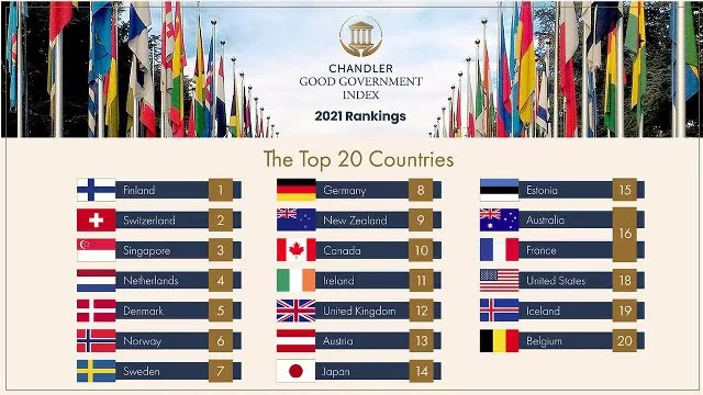 (चांडलर गुड गवर्नेंस इंडेक्स 2021, चांडलर इंस्टीट्यूट ऑफ गवर्नेंस, जिसका मुख्यालय सिंगापुर में स्थित है, इसके द्वारा चांडलर गुड गवर्नेंस इंडेक्स जारी किया जाता है। इस सूचकांक सात स्तंभों जैसे नेतृत्व और दूरदर्शिता, मजबूत संस्थानों, मजबूत कानूनों और नीतियों, आकर्षक बाजार स्थान, वित्तीय नेतृत्व, लोगों के उत्थान, वैश्विक प्रभाव और प्रतिष्ठा में मदद करने के लिए तैयार किया जाता है। )